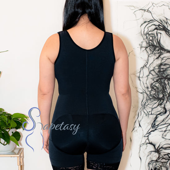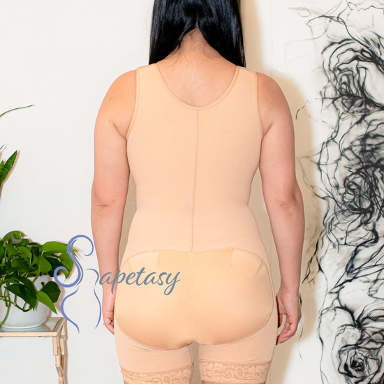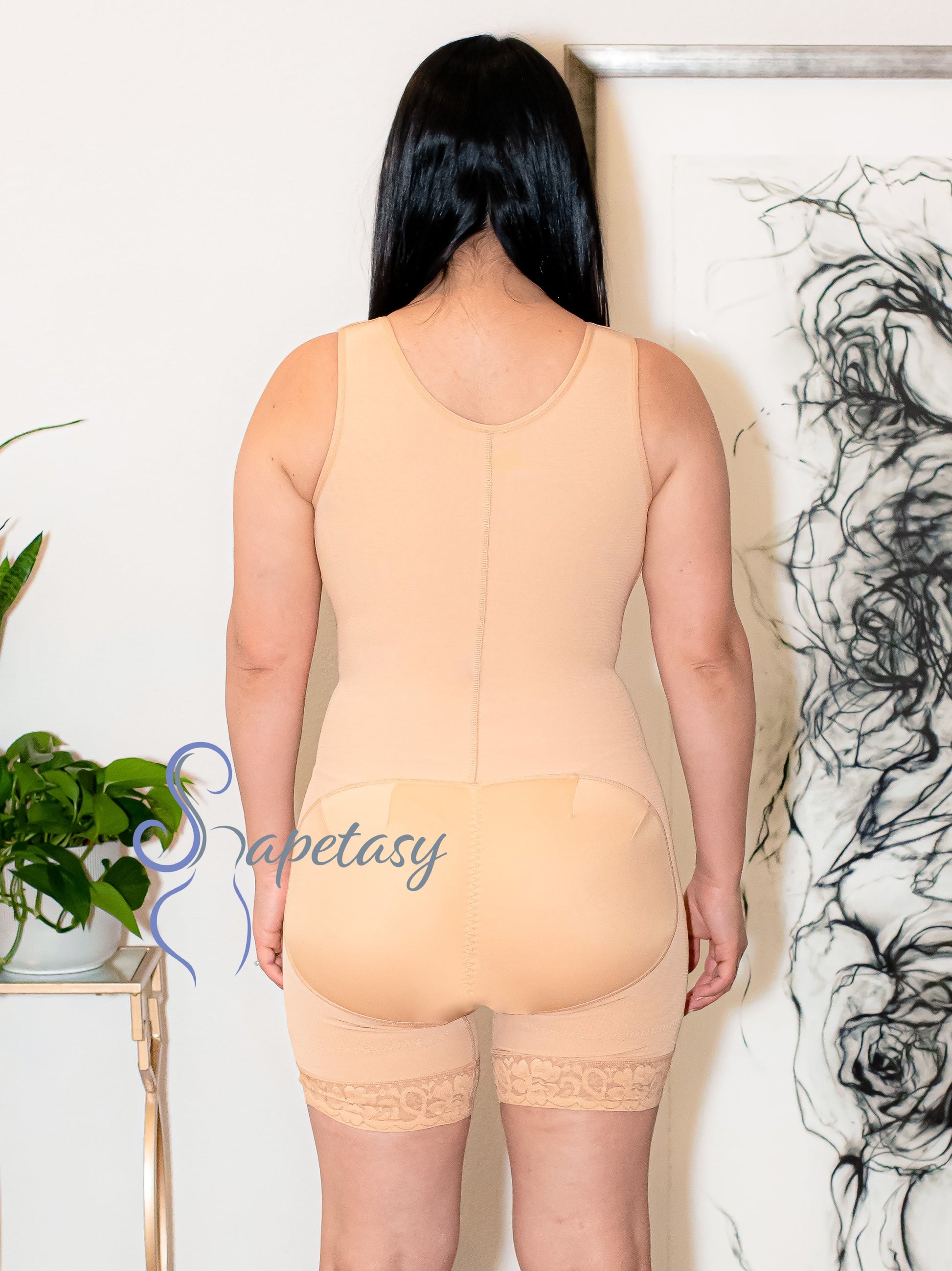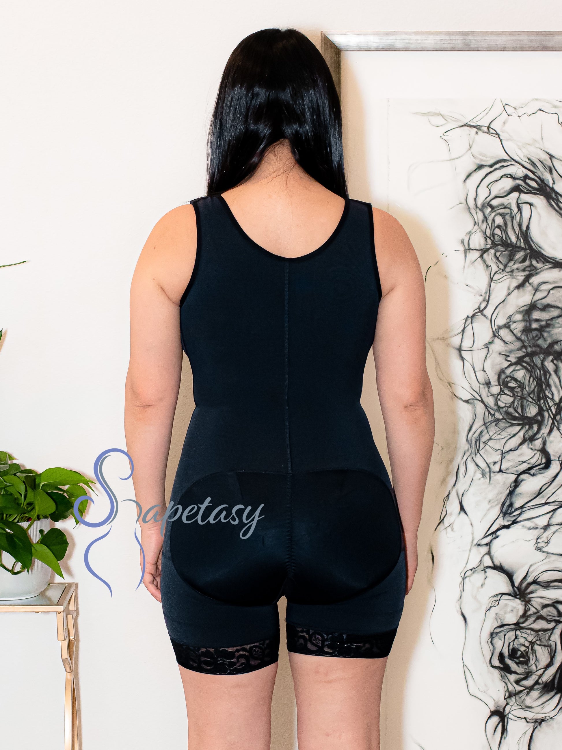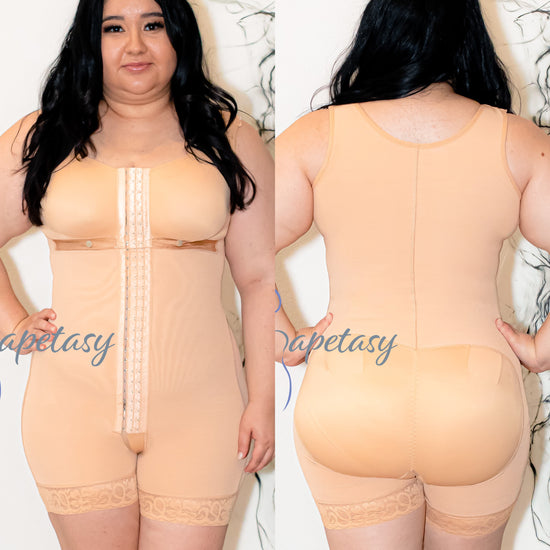 The Lisette Full Body Faja offers a full body compression of the abdomen, legs, back, upper back, and bust support. It features adjustable straps and three rows of eye and hook closures and open crotch to easily use the bathroom. Lisette lifts your butt and shapes your body for a smooth hourglass figure. The attached bra offers great support without suffocating your breasts. This garment has no padding.