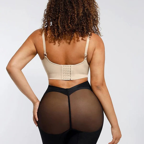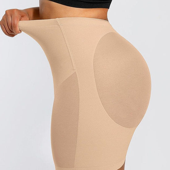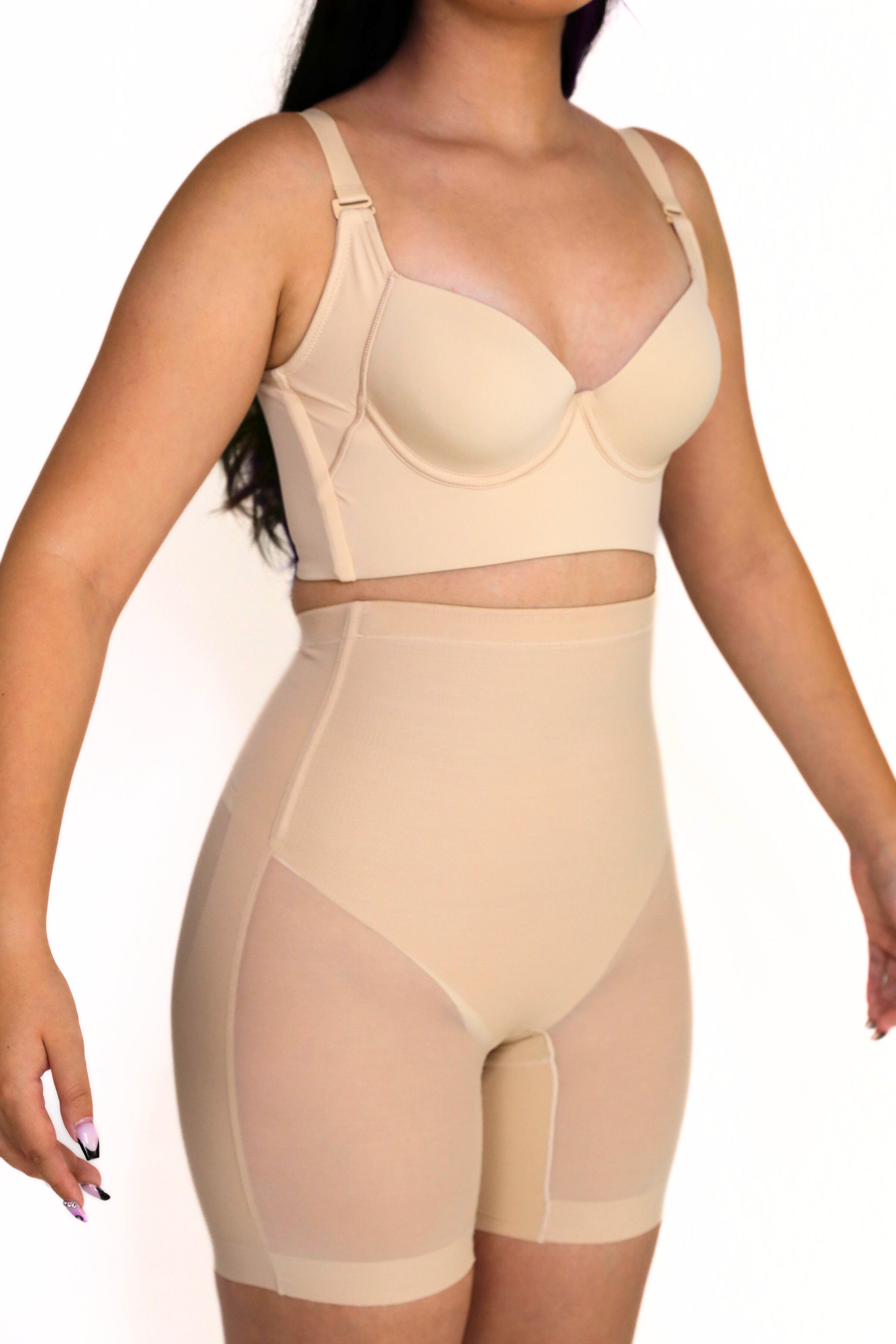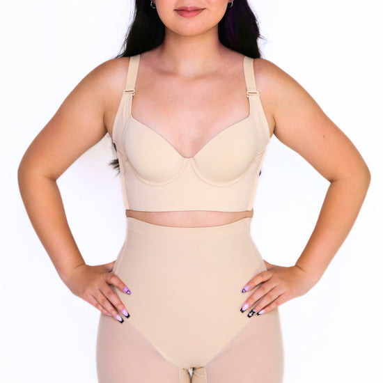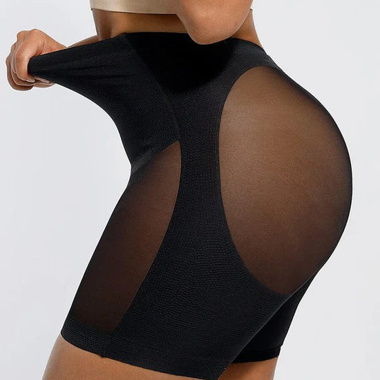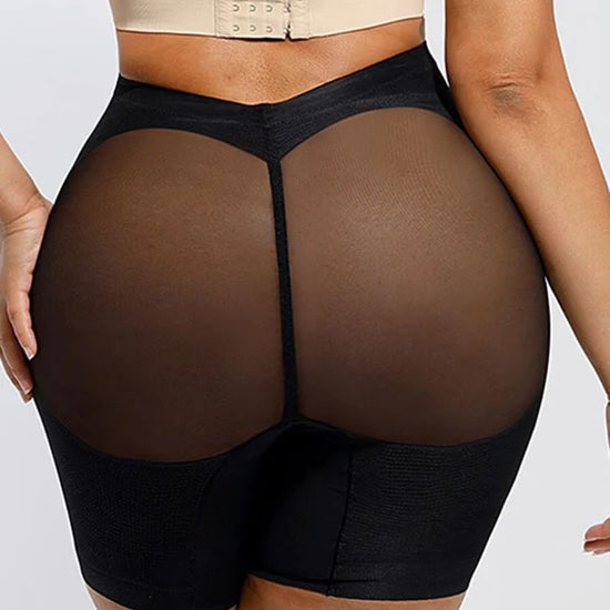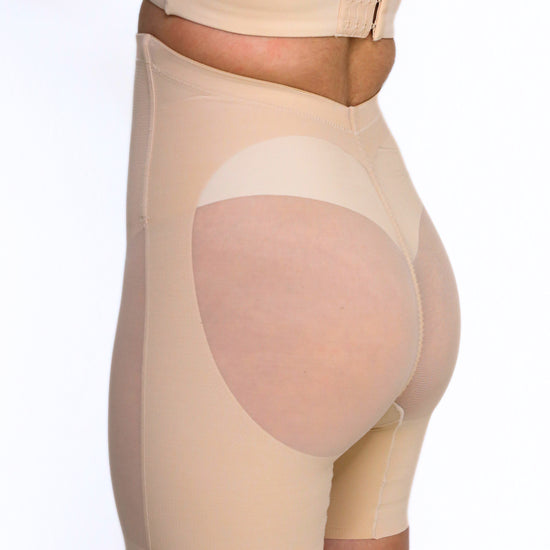 The Nayeli Mid Waist Mesh Faja provides tummy control. The garment lifts your butt to enhance your curves under any clothing and features a lower back to fit with any open back shirts and dresses. This garment has no padding. It also features, two plastic bones and silicone bands to prevent the garment from rolling down, and it has a slit crotch to use restroom.
